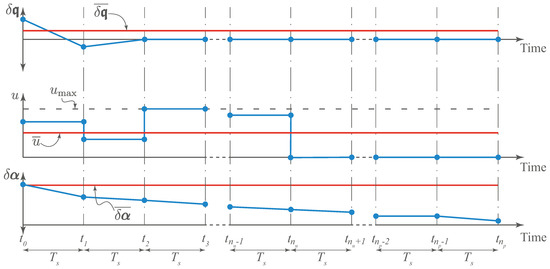 with being the expected value of over the prediction horizon, which is approximated by the ROE vector at the beginning of each horizon, and and being predictions for the values of u and over the control horizon. The approximated expected values, , , and , are illustrated graphically over one prediction horizon in Figure 3. For imaging purposes, each of them is taken to be one-dimensional. Indeed, the values assumed for and are merely the authors’ predictions for the expected values of these quantities over the whole simulation; however, choosing other values for these variables would not affect the final MPC gains, as will be elaborated upon later in the text.