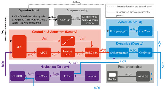 The following section of this paper introduces the formulation of the relative orbital dynamics in the ROE space as well as the adopted surrogate model for the attitude control system. In Section 3, the MPC problem is formally established in the sense that the employed cost function is introduced and the inherent constraints of the problem in hand are presented. The problem of MPC parameter tuning as well as the module execution logic of the closed control loop are discussed in the same section. The stability of the proposed MPC scheme is then tested by means of a Monte Carlo simulation in Section 4, and the proposed MPC is benchmarked against that introduced in [17].