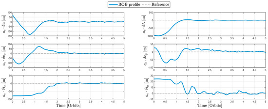 The dimensional ROE profiles of the two MPCs are also shown in Figure 13, and a brief comparison between the performance of both schemes is presented in Table 6, where the convergence time is defined as the time it takes all elements in the error-dimensional ROE vector, , to be less than .