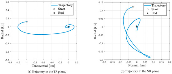 The trajectory followed by the satellite is depicted in Figure 9 in both the transversal–radial and the normal–radial planes. This trajectory could be obtained by transforming the ROE to the relative Cartesian states in the RTN frame using the transformation in [26]. It can be seen from Figure 9a that the orbit maneuver is taking place gradually thanks to the continuous firing of the thruster, in contrast to the impulsive-thrust maneuvers where the velocity changes at a handful of points on the orbit.