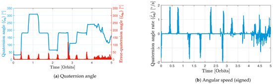 where and are the vector and the scalar parts of the quaternion , respectively. Lastly, the effect of adding the term to the cost function of Problem 1 could be seen clearly in Figure 11b, where the quaternion angle rate is depicted. The quaternion angle rate, which can be thought of as a signed version of , is seen to be much lower than its maximum allowable values, . Our preliminary simulations, which did not contain the term on their cost function, always had the attitude rate saturating at its maximum value, which is a hyper-reaction that is not desired in a real mission.