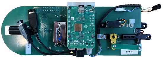 Each drs capsule comprised a Raspberry Pi 3B attached to a custom 300 mm × 125 mm printed circuit board (pcb; see Figure 1). The capsules were powered by switchable 24 V DC from the main payload while they were attached, then by two internal 9 V lithium batteries after release. These batteries were the only components of the drs that could be considered potentially hazardous. However, they were compliant with safety test criteria T1–T8 defined in Section 38.3 of [5]. The drs used a geared pincer mechanism to hold on to a loop of nylon cable tie underneath the main payload. After coordination with local air traffic control, we issued a sequence of three commands (to prevent errors and fault propagation) that used a servo inside the drs to open the pincer, allowing the drs to drop away.
