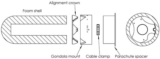 The drs capsules hang underneath the payload (here, down is shown to the left). They are prevented from swinging or rotating by a 3D-printed ‘alignment crown’ fixed to their top, which fits inside a mount on the gondola that has an inverted shape.