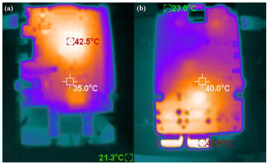 Thermal imaging of the top and bottom of a Raspberry Pi, during testing in a room temperature laboratory. Thermal emission is interpreted as temperature (red, white, green numbers), assuming emissivity . (a) The main cpu is the hottest component while executing a simple Python script. Nothing is attached to the usb sockets in this image. (b) The underside of a Pi attached to a drs, oriented as in Figure 1. The heat sink and sd card containing the operating system are now cold at the top, but the usb sockets become hot during file transfer to sd cards in small readers mounted in the usb sockets.