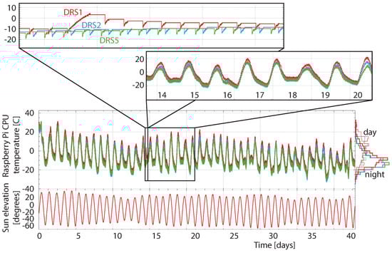 Self-reported cpu temperature of the Raspberry Pi on each drs during the superBIT mission for drs1 (red), drs2 (blue), and drs5 (green). Temperature principally varied with the 45 diurnal cycles in 40 days (superBIT crossed the international date line 5 times), the length and extent of which varied with superBIT’s speed and latitude. The histogram on the right splits times by positive or negative solar elevation. Insets show temperature variations with increased temporal resolution, including, for illustration, the one occasion when drs1 was left powered on for 30 min. Temperature measurements were only available when a drs was powered on, and horizontal lines merely show the last reported temperature.