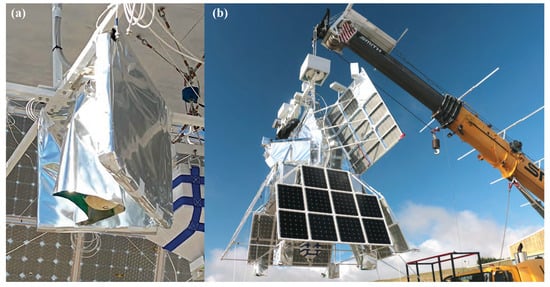 (a) Close-up of a drs in flight configuration. The closed-cell foam shell surrounding the drs can be seen poking out below a skirt of aluminised Mylar. It is further protected on two sides by sheets of foam insulation also covered by aluminised Mylar. Cables are routed upwards on the mounting frame. (b) superBIT suspended on the launch crane. Four drs capsules can be seen at the bottom, each attached to a corner of the frame holding the solar panels. The blue and white object hanging between them is a ballast hopper. Throughout its mission, the telescope keeps its back (on the right in these photos) oriented towards the Sun.