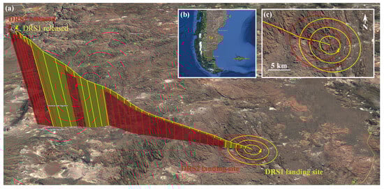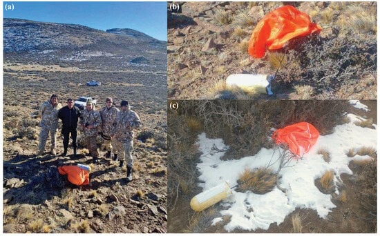 Landing sites of the drs capsules in Argentina. (a) General terrain and the search and rescue team from the governor’s office of Santa Cruz Province. The bright-orange parachutes of drs1 (b) and drs2 (c) were visible from a distance. The white foam shell and release crown were finally also visible; the foam helped to insulate and waterproof drs2 when it landed on snow.