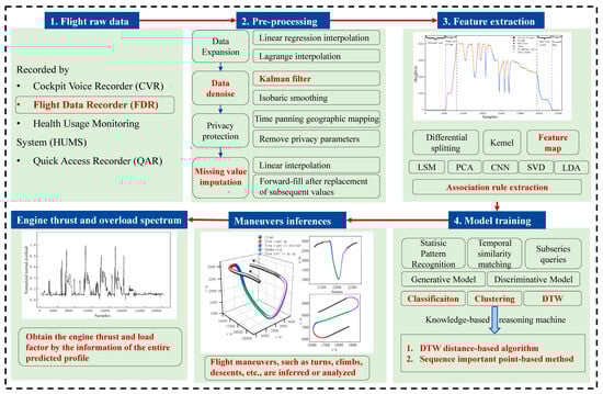 In this paper, based on the data characteristics of a certain flight test data, two novel clustering methods of maneuver recognition are proposed based on the DTW distance-based algorithm and important points in the time series mining technology. According to the basic knowledge of flight mechanics and the transformation relationship between aircraft coordinate systems, the differential dynamics equation of the aircraft’s center of gravity in the trajectory coordinate system is established. Taking a given flight data model as an example, the calculation process of engine thrust and load factor is proposed. The thrust and load factors under different maneuvering states are calculated. Finally, based on the preprocessed data and criteria, the flight profile is clustered and recognized, and the altitude, engine thrust, normal load factor, and tangential load factor of a typical profile are estimated. The standard workflow, including the method (marked in red) used in this paper, can be summarized as follows in Figure 1: (1) Acquiring fundamental flight parameter data from the Flight Data Recorder (FDR). (2) Preprocessing of the flight parameter data, including noise reduction and missing data imputation. (3) Identification of features within the flight parameter data. (4) Training machine learning models utilizing classification, clustering, and DTW techniques, incorporating novel approaches proposed in this paper. (5) Prediction and analysis of maneuvers. (6) Compute the engine load factor for the given flight mission.