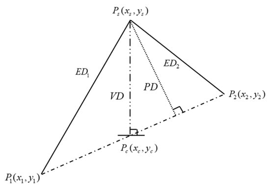 First, the basic PLR–PIP algorithm is reviewed. Generally, the perceptually important point (PIP) in the time series is the point with the greatest distance value. Three distance measurements are commonly used: perpendicular distance (PD), vertical distance (VD), and Euclidean distance (ED) [26]. Figure 2 shows the three distances for a point in a certain sequence. For all three distances, the number of calculations required is the same. The graphs fitted by PD and VD are the same, but the value calculated using VD distance is the smallest. Therefore, this paper uses VD distance as the measurement value when analyzing flight parameters.