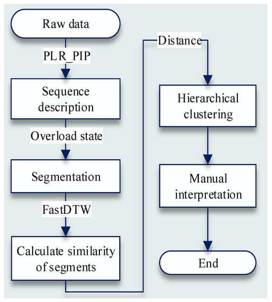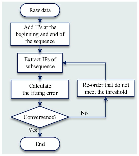 Based on piecewise linear representation (PLR), a PLR–PIP method with a time series was proposed. The time series was represented by X = (x1, x1, …, xn) and the important series set the important points (IPs). The first point of the sequence is added to the set IPs. Then, each pair of adjacent points is taken as a sub-sequence and the PIP points are calculated and added to the set IPs. Adjacent PIP points form a new sub-sequence, which is linearly interpolated, and the root mean square error (RMSE) is calculated with respect to the original sequence. Sequences are extracted with RMSE values that do not meet the fitting error threshold condition. These steps are repeated until all sequences meet the threshold requirements . The algorithm flow is shown in Figure 3. According to this description of the improved strategies, PLR–PIP is given in Algorithm 1.