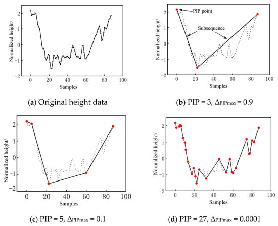 Taking the altitude data of a certain flight as an example, the PLR–PIP calculation is performed with a fitting error threshold set to ΔPIP = 0.0001. The calculation process is demonstrated in Figure 4, where the dashed line represents the original sequence, the red dots represent PIP points, and the straight line represents the shape described using PIP. As the number of PIP increases, ΔPIP gradually decreases, and the data compression efficiency decreases as well. Therefore, the threshold ΔPIP needs to be set according to the actual situation.