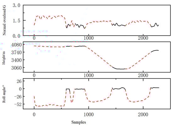 (1) Algorithm 2 obtains maneuver segments by analyzing the feedback from flight parameter data in different aircraft maneuvers. This method can capture more segments during high-intensity maneuvers and accurately identify and categorize complex composite maneuvers, such as half-rolls, somersaults, and other specific maneuvers. For instance, Algorithm 2 classifies the maneuver as a complete maneuver segment (maneuver class 4), which, upon manual inspection, represents a tactical composite maneuver that sequentially includes the continuous sequence of climb, right turn-climb, right turn-descent, dive, left turn-climb, climb. However, for smoother maneuvers where the rate of change in flight parameter data is small, it may be challenging to precisely extract maneuver segments, resulting in a degree of recognition error.