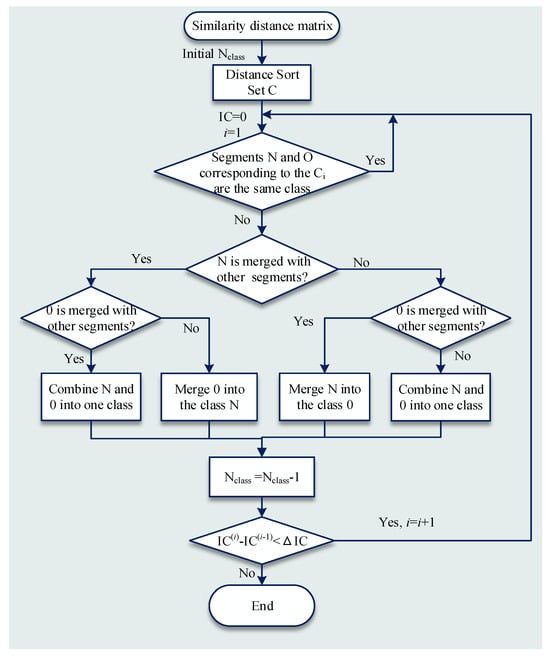 The hierarchical clustering analysis is performed for the similarity distance matrix due to its high precision and strong generality. However, after merging two classes each time, the hierarchical clustering algorithm must recalculate the distance matrix between classes, which burdens the computation when the number of classes is large. Therefore, an improved hierarchical clustering algorithm is proposed in this paper, and the algorithm process is shown in Figure 7.