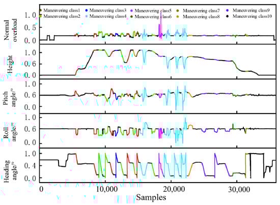 Due to the sensitivity of the foundational flight parameter data, normalization procedures are applied to the raw data using the following formula: DNorm = (D − Dmin)/(Dmax − Dmin). The MFR results based on the proposed DTW distance-based algorithm are shown in Figure 8; the straight flight segments formed during the middle partition process are defined as one class (i.e., class 10) without hierarchical clustering. Finally, 9 classes of maneuvers are formed, with a total of 22 maneuver segments. It can be seen that within a maneuver class, the trend and magnitude of the flight parameter data for each maneuver segment are similar, while significant differences exist between different maneuver classes.