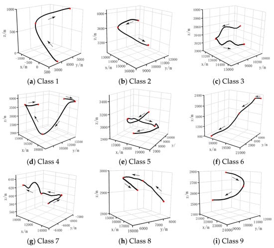 Classification of maneuver with motion locus into 9 class based on the flight data, (a–i) shows 9 different maneuvering types that are manually defined, where the red dots represent turning points in maneuvers.
