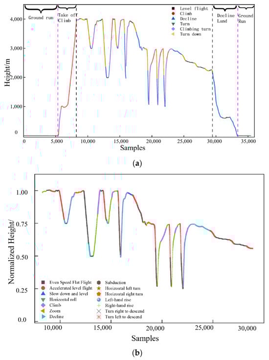 The key technique in maneuver recognition lies in extracting features from a large amount of data to match corresponding maneuver actions [9,10]. For example, Ni et al. and Wang et al. [11,12] constructed a flight action recognition library, which draws upon the experience and knowledge system of aircraft designers to identify flight maneuver actions. Sharif et al. [13] introduced a modification to dynamic time warping (DTW) known as context-based DTW (CDTW), capable of evaluating the multidimensional weighted similarities between trajectories. Meng et al. [14] used a Bayesian network model constructed from statistical feature curves of flight parameter data to recognize complex maneuvering actions. Lu et al. [15] recognized and classified the normal load factor data based on the flight parameter data, combined with the new method to cluster flight parameter data segments to obtain multiple types of aircraft maneuvering actions.