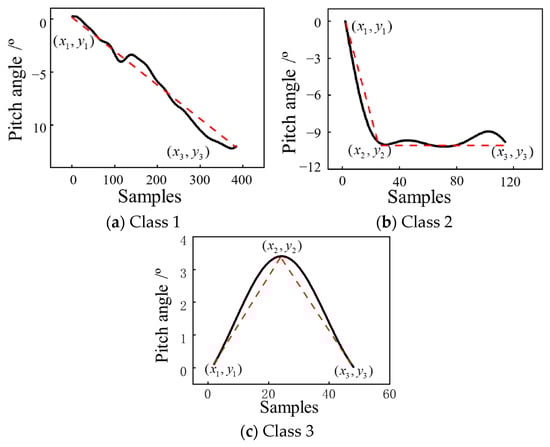 Classification of pitch angle, where the red dashed line represents the results of linear fitting. (a–c) represent parameter fitting results for three different scenarios, respectively.