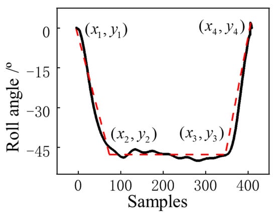 The variation in the aircraft’s roll angle typically corresponds to turning maneuvers. The aircraft’s roll angle begins at 0° and increases at a specified rate to reach the prescribed roll angle. Depending on the specific maneuver, it maintains the current roll angle for a certain period. It then returns the roll angle to zero at a fixed rate, marking the end of the action, as illustrated in Figure 18. In most cases, the rate of change in reaching the extreme value of the roll angle and returning from the extreme value to zero is the same. Therefore, similar to the pitch angle, it can be fitted using three linear equations where x1 corresponds to the start time of the action, x2 corresponds to the time of the roll angle reaching its extreme value, x4 corresponds to the end time of the action, y1 corresponds to the initial roll angle at the start of the action, and y2 corresponds to the roll angle at the extreme point of the action. In Figure 18, the black curve represents the observed changes in the aircraft’s roll angle during maneuvers, and the red curve (dashed line) represents the linear fitting result.