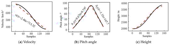 As shown in Figure 19, the black curve represents the observed velocity, pitch angle, and altitude profiles during the maneuver action. The red curve (dashed line) represents the results of linear fitting for the velocity and pitch angle profiles and the altitude profile after integration.