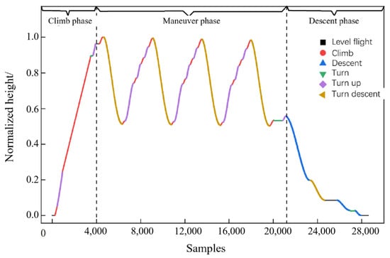 By solving the parameter histories of each maneuver, the flight trajectory information of the entire predicted profile, and the engine altitude change under the typical profile can be obtained, where the altitude coordinates have been normalized (Figure 20).