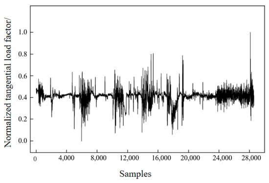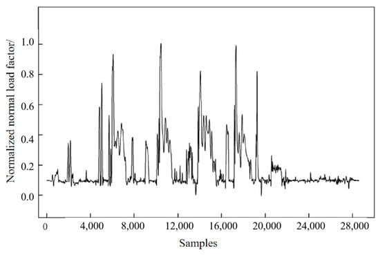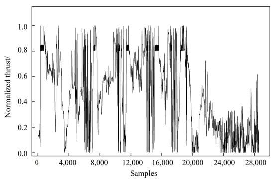 To obtain the engine thrust and load factor of the typical profile, the aircraft performance information and height, pitch angle, roll angle, etc., obtained from steps 1 and 2, are combined with the thrust and load factor calculation method in Section 4.1. The predicted engine thrust, engine normal load factor, and the tangential load factor of the typical profile can be obtained, as shown in Figure 21, Figure 22 and Figure 23, where each parameter on the vertical axis has been normalized.