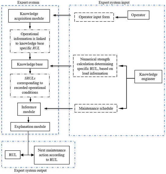 Knowledge base stores the specific remaining useful lives (SRULs) of the observed part. For example, the RUL of a part affected by material fatigue is influenced by the variability of operational loads it experiences. To predict RUL, an average of these variable loads is computed and used to determine the SRUL by means of numerical strength calculation. The knowledge base contains a repository of these SRULs, each corresponding to the RUL of the part under distinct load profiles and operational conditions. By inputting actual operational data from mandatory records into the system, the expert system finds the corresponding SRUL values and calculates the part’s RUL.