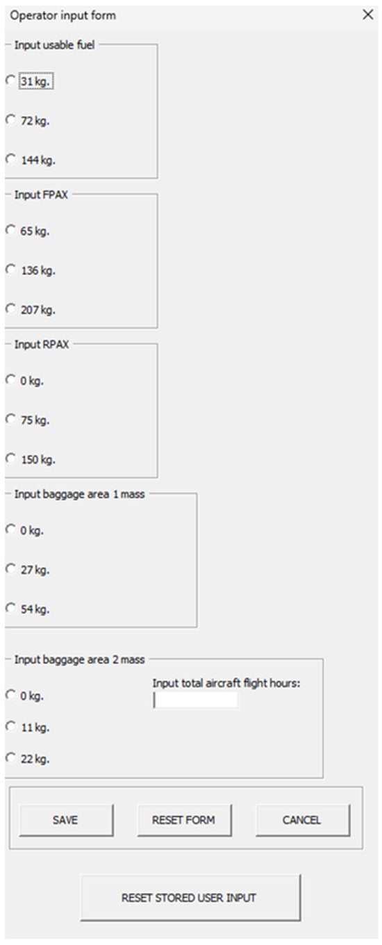 An operator input form was created to validate methods in the case study. The form, as shown in Figure 2, enables data extraction from mandatory mass and balance sheets and/or aircraft logbooks.