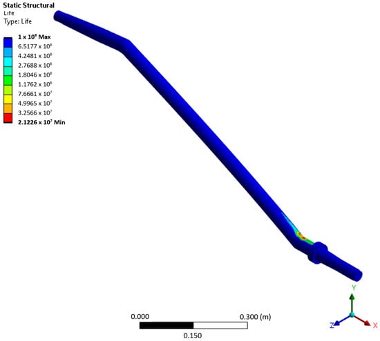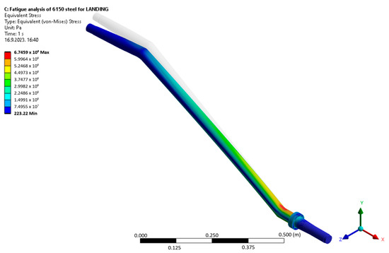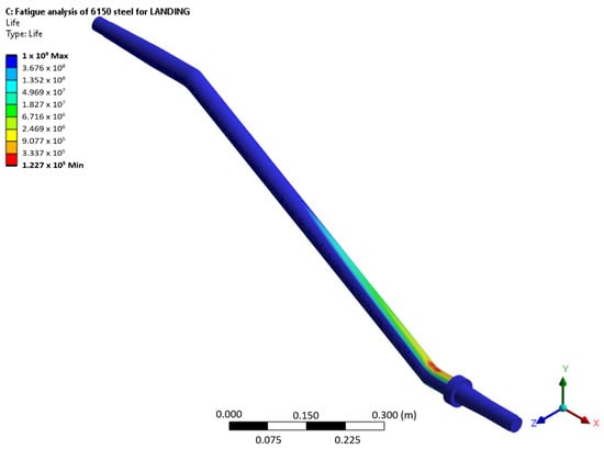 Fatigue life analysis results were first observed for the last phase of operation, namely, the return of the aircraft from the landing strip after landing. This corresponds to a mass value and distribution scenario consisting of 31 kg of fuel in the fuel tanks and 65 kg in the front-row crew seats. Figure 6 shows the distribution of RUL, having a minimum in the expected location of the observed geometry based on aircraft production and maintenance experience, literature research, and stress analysis results observed later in this chapter. Note that the leg part with the minimum RUL is close to the leg’s fixed attachment position to the aircraft’s fuselage. The material and mechanical properties relevant to strain life curves used to determine the observed landing gear leg RUL made from a 6150 steel alloy, also referred to as the 51CrV4 steel alloy, were determined through rigorous literature research. This involved a review of academic journals, industry publications, and technical reports [27,28,29,30,31,32,33,34], leading to the identification of key material fatigue-relevant properties. The properties of this alloy include a density of 7850 kg/m3, Young’s modulus of 2.038 × 1011 Pa, Poisson’s ratio of 0.29, strength coefficient of 1.1 × 109 Pa, strength exponent of −0.093, ductility coefficient of 0.478, ductility exponent of −0.684, cyclic strength coefficient of 1.476 × 109 Pa, cyclic strain hardening exponent of 0.0651, tensile and compressive yield strength of 1.042 × 109 Pa, and tensile ultimate strength of 1.2773 × 109 Pa. Program-controlled element order and adaptive element sizing, with a maximum element size of 1.4 × 10−2 m, have culminated in an acceptable RUL regarding prediction expectancy based on the recorded number of airplane landings in the airplane technical logbook.