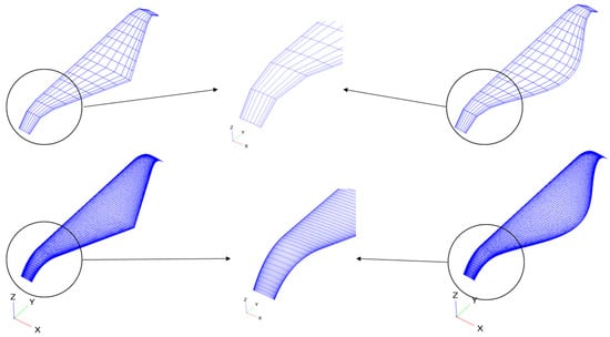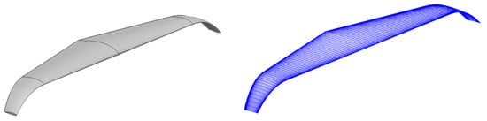 In this work, the open-source aerodynamic analysis solver VSPAERO, is utilized to predict the aerodynamic coefficients of a lifting wing. VSPAERO offers two potential flow techniques: the panel method and the vortex lattice method (VLM) [26]. In this work, VLM method is used to compute aerodynamic loads along the span, coefficient of lift , stability derivatives term and induced drag coefficient . In the VLM method, camber surface of the wing is treated as the lifting surface and is discretized into a series of quadrilateral panels both in the chordwise and spanwise directions, each with a different orientation to account for the changing camber and twist along the span. Figure 1 illustrates the wing and its panel discretization of the cambered surface.