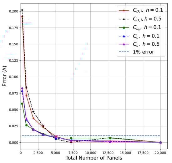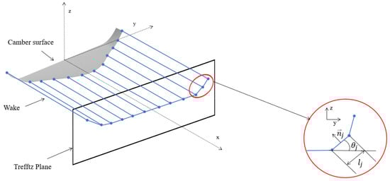 Here, represents the number of wake panels, is the density of the freestream flow, and denote the vortex strength and induced velocity at the mid point of the jth wake panel. Additionally, and represent the orientation and length of the jth wake panel in the Trefftz plane as shown in Figure 2. The accuracy of the VLM method within VSPAERO for calculating subsonic aerodynamic quantities has been demonstrated in the author’s previous work [25]. Due to its simplicity and low computational cost, the VLM method has gained increased applicability and is widely used in other open-source tools such as Athena Vortex Lattice (AVL) [30] and OpenAeroStruct for aerostructural analysis and optimization [31].