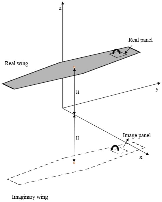 The method of images is a widely recognized approach that can be integrated with any potential flow algorithm to predict aerodynamic coefficients of a lifting wing in ground effect [29]. In VSPAERO, the wing is initially set to the desired angle of attack , and a mirrored set of panels is created on the imaginary wing which is positioned at a distance 2H from the center of gravity of the main wing, as shown in Figure 3. This effectively simulates the reflection of the real wing across the plane of reflection. Each panel on the real wing corresponds to an associated image panel. The aerodynamic influence matrix A now incorporates the influence of both the real and image panels on each control point, and represents the vector of vortex strengths (circulations) for all panels, including both real and image panels . By combining the flow around the main wing with its mirror image, the downwash generated by the main wing is precisely counteracted by the upwash generated by its mirror image, resulting in a net zero flow normal to the plane of symmetry. This effectively represents a solid and flat ground. For this study, optimisation is conducted under the assumption of WIG aircraft operation above a calm sea. As a result, the influence of surface waviness on calculated aerodynamic coefficients is not taken into consideration.
