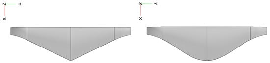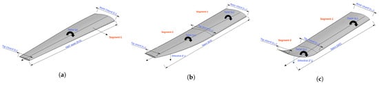 In this study, OpenVSP geometry tool is used to parameterise the wing planform and handle surface mesh deformations in the design process. OpenVSP (Vehicle Sketch Pad) is an open source parametric computer-aided design (CAD) tool that is specifically designed for the conceptual design of aircraft [26]. It allows for rapid parameterisation of geometries at various levels, including planform alterations and local surface changes using the CST parameterisation method [38]. One of its unique features is the blending tool that allows for smooth transitions between different shapes or sections of a design, particularly for wing and blended wing body configurations. The blending tool uses NURBS curve to define the shape of the blend between root and tip section of a wing segment and has several parameters that can be adjusted to control the shape of the blending curve including the strength parameter , which is considered in this study. The strength parameter determines how quickly the transition occurs between two sections. This effect is shown in Figure 5, which showcases the impact of the strength parameter on the inboard segment of the wing. A higher strength value results in a more gradual transition, while a lower strength value leads to a more abrupt transition. Incorporating the blending tool within the design process ensures smoothness along the spanwise direction, negating the need for additional constraint handling procedures. The ATR 42-600 model shown in Figure 4 is designed using OpenVSP. To investigate the impact of planar and nonplanar wing configurations for ground effect applications, the wing planform is parameterised using the following three different cases.