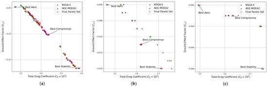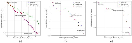 In a multi-objective optimisation problem, the goal is to obtain a set of Pareto optimal solutions that are both diverse and close to the true Pareto Front in terms of proximity or convergence. The design space for nonplanar lifting surfaces is very complex that could lead to multiple local minima [13]. In addition, the presence of ground effect conditions in multi-objective wing planform optimisation can make the problem ‘stiff’. For instance, when optimisation is performed at a height ratio of 0.5, which lies at the border of the ground effect, the wing planform may not experience the same cushioning effect as it would at a height ratio of [25]. This difference in ground effect can make the design space complex, potentially leading to challenges in finding a diverse set of optimal solutions that satisfy the design requirements. Therefore it is necessary to validate and verify optimisation results before conducting post-optimality analysis. Therefore in this work, each optimisation is performed using two different multi-objective optimisation algorithms, Non-Dominated Sorting Genetic Algorithm (NSGA-II) [40] and Adaptive Geometry Estimation based Multi-Objective Evolutionary Algorithm (AGE-MOEA2) [41]. Pareto set obtained using NSGA-II and AGE-MOEA2 are denoted as and respectively, which are then combined using a Pareto Set Union strategy which is denoted as . Then, non-dominated solutions are selected from to form the final Pareto set, denoted as . This approach provides a diverse set of solutions for post-optimality analysis, ensuring that the solutions are not biased towards a specific algorithm. It is important to note that this procedure is computationally expensive, as it requires solutions from both optimisation algorithms. The intention here is to ensure the robustness and diversity of the final Pareto set, rather than suggesting the Pareto set union strategy approach as a practical application standpoint.
