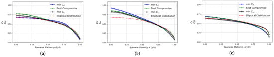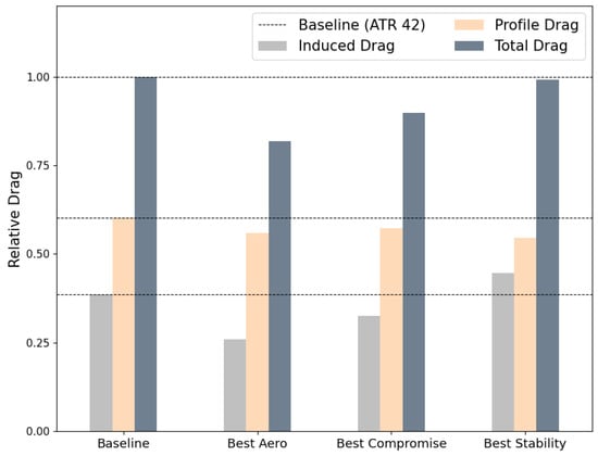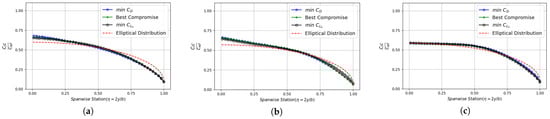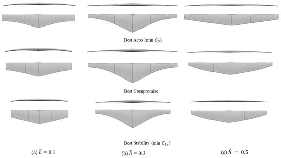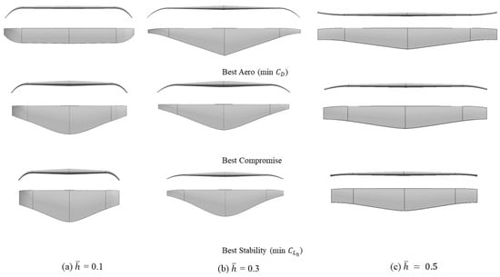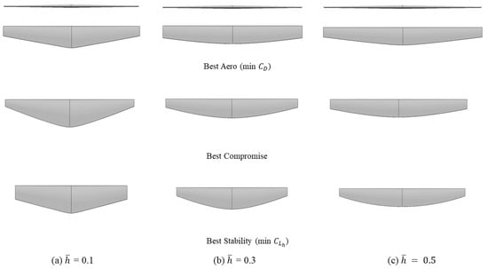 In this section, geometric characteristics and aerodynamic performances of the optimised wing planform geometries are presented and discussed. For each optimisation case, the post-optimality analysis module selects three solutions from the final Pareto set . These solutions include “best aerodynamics” which denotes the solution with minimum total drag coefficient , “best stability” which denotes the solution with minimum ground effect factor and “best compromise” which represents the optimal compromise solution.