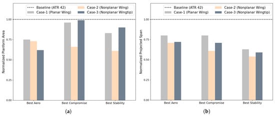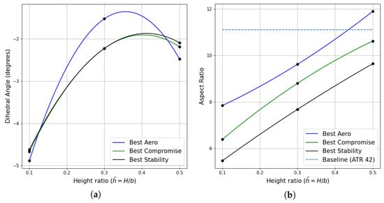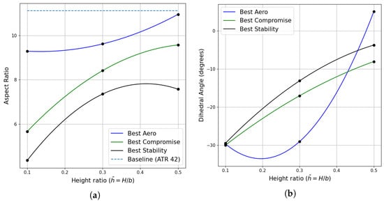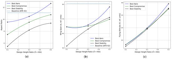 The first case considers only planar deformations. The wing planform geometry is parametrised using one wing segment and a total of six design variables are considered, as given in Equation (17). Figure 10 shows the Pareto fronts obtained for Case-1 wing planform optimisation using both NSGA-II and AGE-MOEA2 algorithms for three different design height ratios . The final Pareto front represents a boundary that cannot be improved in one objective without sacrificing the other. A clear trade-off between the two objectives is shown in the Pareto front, with lower values leading to higher values and vice versa. Figure 10 also highlights the best compromise solution for each height ratio. Although not shown here, the average fitness values observed over last 20 generation exhibited minimal improvement, remaining within the range of which ensures sufficient convergence for the optimisation. To ensure fair comparisons between both algorithms, the optimisation process continued until reaching the maximum number of generations.