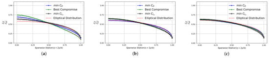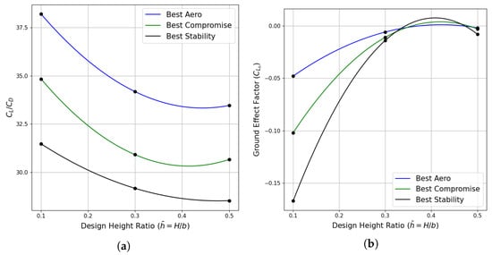 As shown in Figure 12a, at , the optimised wing for best aerodynamics has a higher aspect ratio than the baseline configuration. As discussed earlier, the benefits of ground effect are not as significant at this height ratio, so the optimiser increases the aspect ratio to minimise the induced drag contribution. However as the height ratio decreases, the advantages of ground effect become more apparent, hence the optimiser reduces the wing span of the optimised designs, as shown in Figure 12b. On the other hand, to minimise the ground effect factor , the optimiser converges to low aspect ratio (short and wide) wing configurations. In close proximity to ground, air is circulated around the wingtip due to the deflection of downwash by the ground, resulting in a cushion of high-pressure air between the wing and the ground. This cushion effect is stronger when the downwash is stronger which is the case for low aspect ratio wings, resulting in more air being circulated around the wingtip. Therefore designs corresponding to minimum have small aspect ratio with higher root chord and larger surface area. This configuration results in a large volume of air being compressed between the wing and the ground, creating a stronger cushion of air that enhances lift as the flying altitude decreases. This trend is aligned with the closed-form analytical expressions for lift and induced drag estimations for ground effect conditions proposed by Phillips and Hunsaker [45] for untwisted planar wing configurations. Result indicates that, when the cross sectional shape is fixed, the cushion effect is also proportional to the root chord of the wing. This chord-dominated ground effect increases lift as the wing approaches the ground, contributing to an overall increase in aerodynamic efficiency. In this study, the lift coefficient is fixed at all height ratios. Therefore as the height ratio decreases, the optimiser decreases the required aspect ratio and planform area to achieve the desired lift coefficient. To visualize the trend, Newton’s polynomial interpolation is employed to fit the best solutions with the range of height ratios. It is worth noting that additional data points may be necessary to enhance the accuracy of the trend analysis. Once the optimised span has been obtained, the optimal flying altitude can be calculated using the linear relation between the height ratio () and wing span . Figure 12c shows the optimal flying altitude for each optimised design.