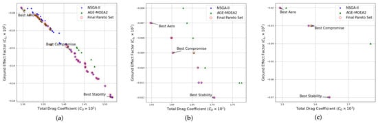 Comparison of Pareto plot for wing planform optimisation (Case-1): (a) (b) (c) .