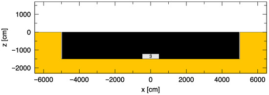 The geometry was a hemisphere recreating a mini moon with a radius of 150 m and a lunar base with a dimension of 10 × 10 × 3 m. Due to computational limitations, the radius of the simulated mini moon was set at 150 m. However, this size was sufficiently large to ensure that all GCRs were in an effective range on the surface. The base was covered with 1 cm thick aluminum as a shielding material against GCRs. The lunar regolith composition implemented in the simulation is presented in Table 1 and is the default composition used in NASA’s online radiation transport tool OLTARIS [20]. Five scenarios on the lunar surface were conducted: (1) a base on the lunar surface; (2) a base set in the middle of a shallow (5 m) crater with a radius of 50 m; (3) a base set in the middle of a deep crater (15 m), also with a 50 m radius; (4) a base near the edge of the crater at a shallow depth; and (5) a base near the edge of the crater at a deep depth. An example of the geometry used is shown in Figure 1. The goal of these simulations was to understand the effect of different lunar base placements of for future exploration missions.