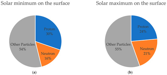 From Figure 2b, it can be seen that the contributions of protons and neutrons were approximately 24% and 21%, respectively, in the case of the moon’s surface during the solar maximum.