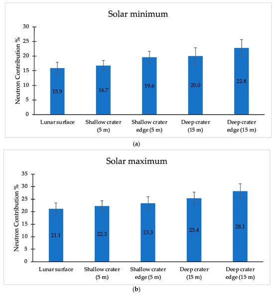 Figure 3 illustrates the neutron contribution to the total dose equivalent by varying the location and solar activity between the solar minimum and maximum. Notably, the neutron contribution increases as the depth of the crater increases. As shown in Figure 3a, the neutron contribution at the moon’s surface was 15.9%. However, alongside the deep crater wall, this contribution increased to 22.8%. Moreover, at the same depth, the neutron contribution at the base next to the wall was higher than that in the middle of the crater. The same trends were found in the case of the solar maximum, as shown in Figure 3b.