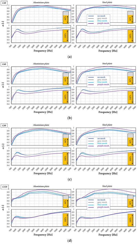All these different sized powders were further tested in the Kundt tube using Φ28 mm honeycomb samples in different combinations with various types of cover (perforated aluminum plate: porosity 28.5%, Øhole1.8 mm, thickness # 0.7 mm/perforated steel plate, porosity 33%, thickness # 1.5 mm) and three different meshes in order to prevent the cork coming out. As powder sizes tend to decrease to enhance the friction effect, a solution is needed to prevent the powder from escaping from the cavities. For G40-G180 granules, three acoustically permeable meshes with different weaves were placed between the cover and the cavity. Because the original tests (Kundt tube) resulted in good absorptions for both 66% and 100%, testing was continued with these two configurations (at least for comparison, even though the greatest effect should be with partial filling, as some energy is dissipated by particle friction). The results (Figure 14) show an increase in the absorption of low frequency noise in comparison with the noise absorption of cork powder with larger grain diameters (as the one used in Le Mans and NLR, where the average size of the particles was around 800 μm for cork powder, which was manufactured using an impact grinding technology).