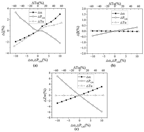 Performance parameter changes versus inlet flow parameter variations: (a) ; (b) ; (c) .
