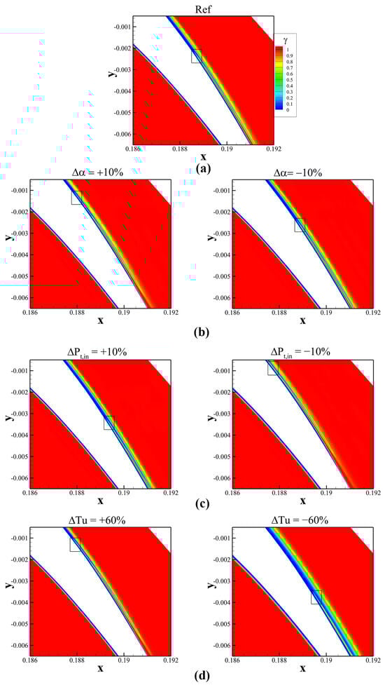 It is well known that the occurrence of laminar flow transition on the suction side of the turbine cascade can usually be found, which immediately and significantly changes the flow loss. To further understand the impact mechanisms of inlet flow variations on the changes of total pressure-loss coefficient, the contours of intermittency factor in the boundary layer of the suction side of the turbine cascade are given in Figure 4. Figure 4b–d are the contours with maximum absolute variations of inlet flow angle, inlet total pressure, and turbulence intensity, respectively. From Figure 4b,d it can be observed that when and are and , respectively, flow transition on the suction side moves upstream compared with the contour as shown in Figure 4a. When and are and , respectively, flow transition on the suction side moves downstream, resulting in reduced flow losses. However, as shown in Figure 4c, the movements of flow transition on the suction side under varied inlet total pressure are opposite compared with those given in Figure 4b,d. In such situations, with respect to exhibits totally different variations compared with those with respect to and , as shown in Figure 3a.