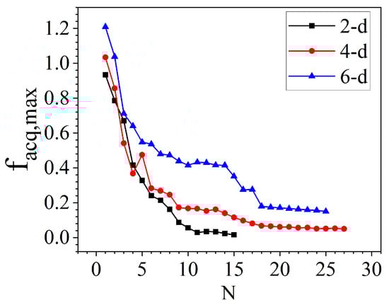 In the domain of function definition, initial training samples of ADGP are obtained by the Latin Hypercube Sampling (LHS) method. The numbers of initial training samples and the thresholds for the three function experiments are given in Table 2, where and are the numbers of initial and total training samples, respectively. Figure 6 presents the convergence history of the maximum acquisition function , where N means the iteration counter. Starting from the initial training samples, decreases, demonstrating the exploitation phase of adaptive sampling and that the prediction accuracy of ADGP is gradually improved.