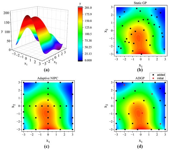 To better distinguish the difference of sample distributions in the same function domain, Figure 7 shows the original two-dimensional function and the distributions of training samples. Compared with the sample distribution of both static GP and ADGP, the samples of adaptive NIPC are concentrated in the adjacent region of maximum value. That is because the new sparse grids are produced by a simple interpolation method, and more grids are required to reduce the interpolation error near the maximum value. In Figure 7d, the red and black points are the initial and adaptively generated training samples, respectively. Compared with the agglomerative sample distribution of adaptive NIPC, the samples of ADGP are more uniformly distributed on the boundaries.