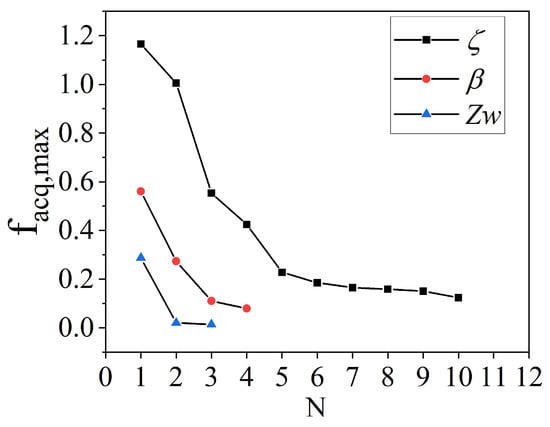 Figure 8 shows the convergence histories of for the three performance parameters. After 10, 4, and 3 iterations, the maximum acquisition function of , and , respectively, decreases to below the corresponding threshold. The total sample numbers are 28, 16, and 14 for training the ADGP models of , and , respectively. The samples necessary for training the ADGP models of and are much less than those of . It is mainly attributed to the more weakened nonlinear dependence of and on the inlet flow variations, as shown in Figure 3b,c. As shown in Figure 3a, is nonlinearly dependent on the inlet flow variations. It thus requires more training samples for model training.