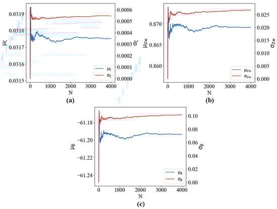 Convergence history of MCS-based statistics: (a) ; (b) ; (c) .