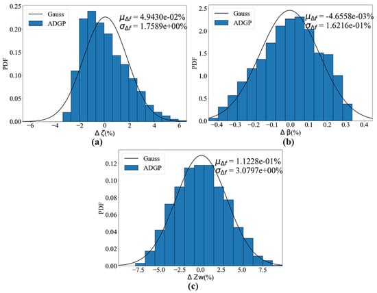 Figure 10 gives the probability density function (PDF) of performance parameters determined from the four thousand test samples. Meanwhile, the Gaussian distributions with the same statistical mean and standard deviation are also given in the figures. From the distributions, it can be observed that the PDFs of and obtained by ADGP are slightly left skewed, demonstrating weak nonlinear dependence of total pressure-loss coefficient and outlet flow angle on inlet flow variations. By contrast, the PDF of obtained by ADGP is close to the Gaussian distribution, demonstrating that the Zweifel number is almost linearly dependent on inlet flow variations. In fact, the linear dependence of Zweifel number on inlet flow parameters can also be found in Figure 3c, where exhibits linear variations in the variation ranges of inlet flow angle, inlet total pressure, and turbulence intensity.