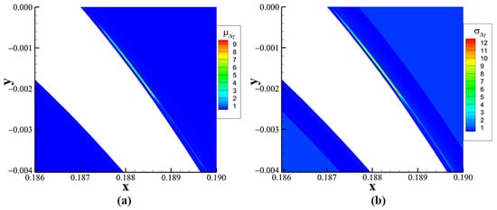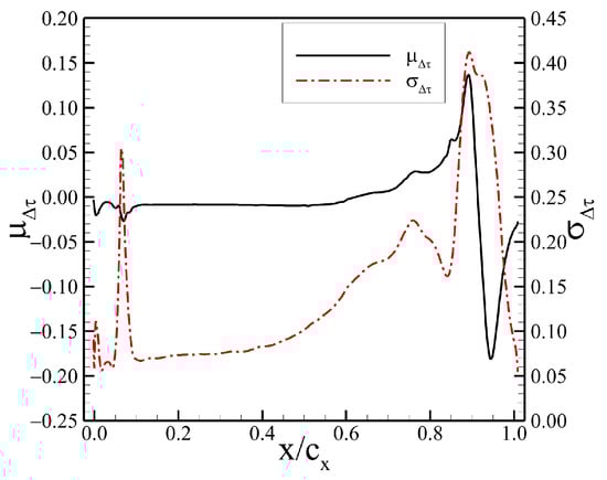 To further uncover the impact mechanisms, the variations of flow solutions on the suction side of the turbine cascade are given in Figure 12. This figure gives the distributions of statistical mean and standard deviation of the relative variation of viscous shear stress , the definition of which is: