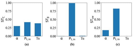 Figure 13 shows the total sensitivities (STs) of performance parameters to each inlet flow parameter. For the total pressure-loss coefficient, the contributions of the three inlet flow parameters to performance change are similar, indicating that the performance impact of each inlet flow parameter needs to be considered. For the outflow angle, the total sensitivity to inlet total pressure is close to 1.0, indicating that the variation of inlet total pressure plays a dominant role in influencing the outflow angle. In Figure 13c, similar results can be found for the Zweifel number. The variation of is dominantly attributed to the inlet total pressure variation. Moreover, the impact of the inlet flow angle on variation also needs to be considered.